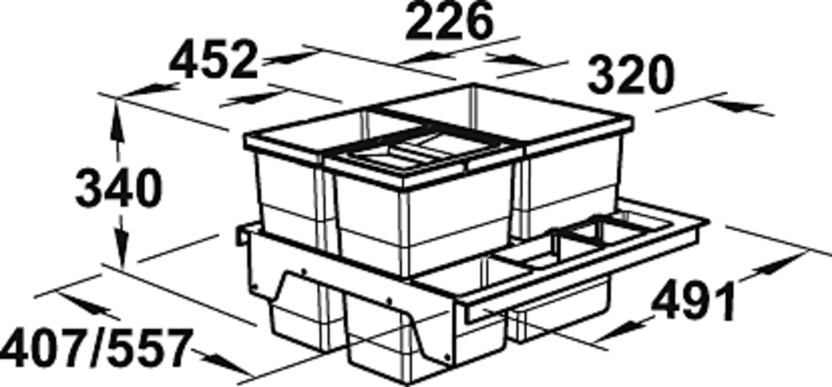 Häfele 502.03.551 / 3-miestny odpadkový kôš Seperato-K 3620-46 pre montáž s výsuvnými systémami, pre šírku korpusu 450 mm, 1x18 a 2x8 L, svetlo sivá