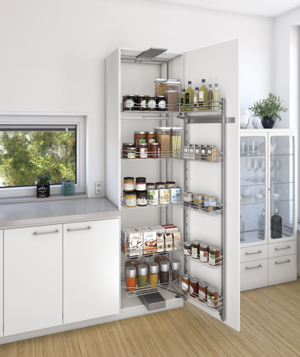 Häfele 546.81.253 / Vnútorný výsuv pre potravinovú skriňu, s policou na dvere a závesnými košmi, drôtený, pre šírku korpusu 600 mm
