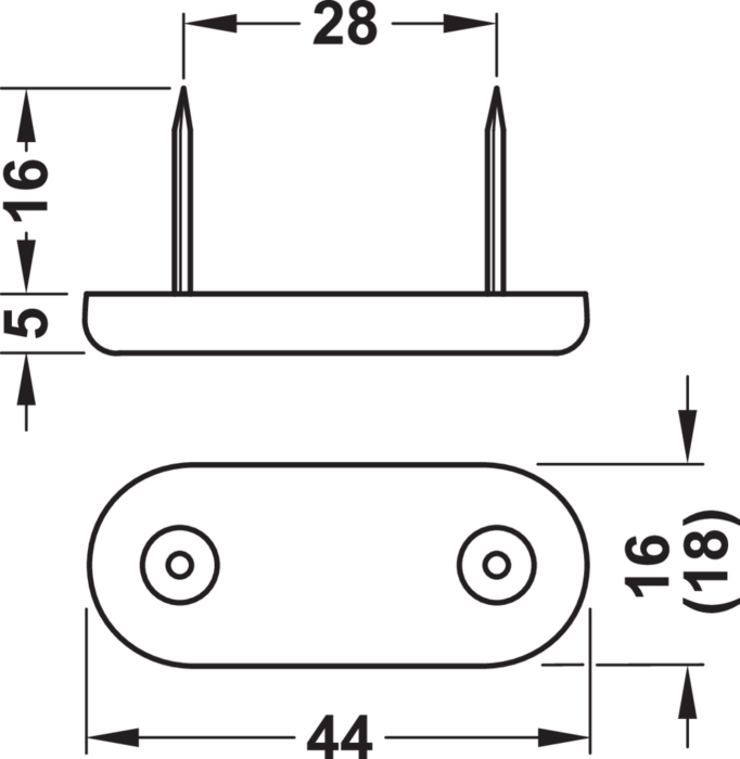 Häfele 650.05.718 / Plastový nábytkový klzák s dvoma klincami k narazaniu, výška 5 mm, dĺžka 44 mm, šírka 18 mm