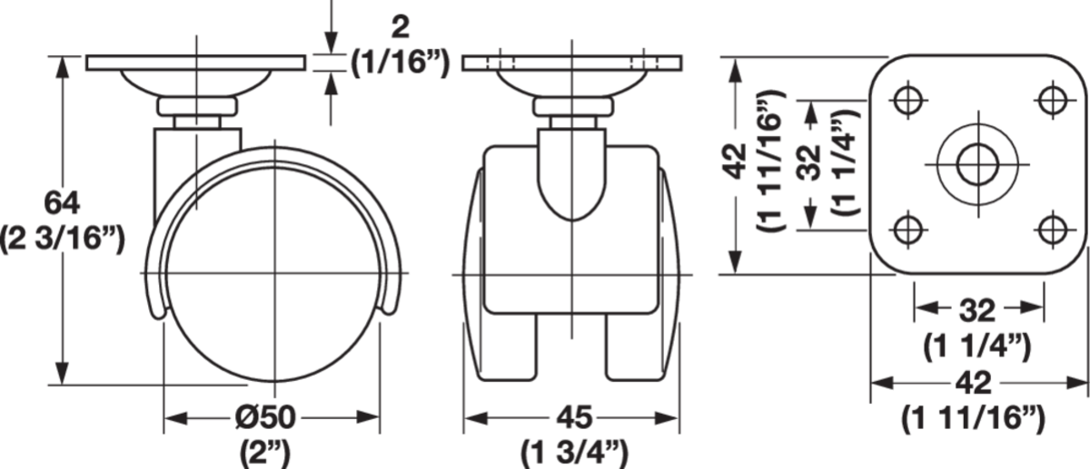 Häfele 660.08.321 / Dvojité nábytkové koliesko, otočné, s krytom, s brzdou, s montážnou doskou, nosnosť cca 40 kg, priemer kolieska 50 mm