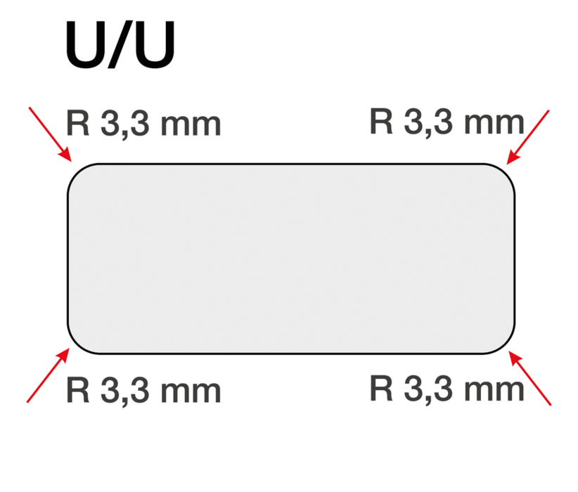 Predné aj zadné pozdĺžna hrana hore a dole zaoblená. Radius vždy 3,3 mm.