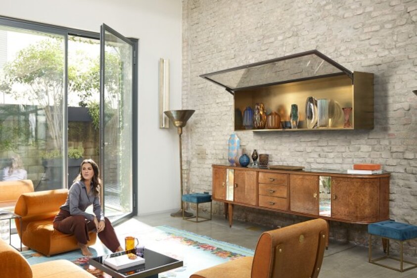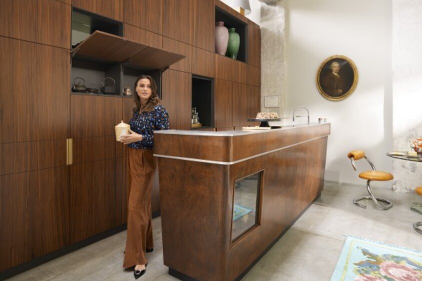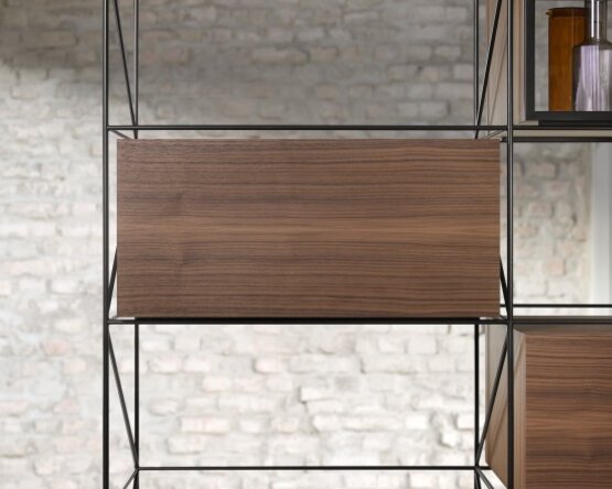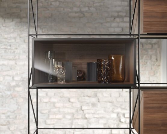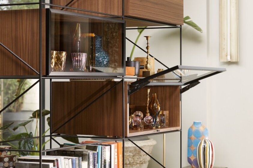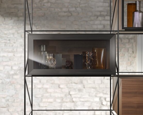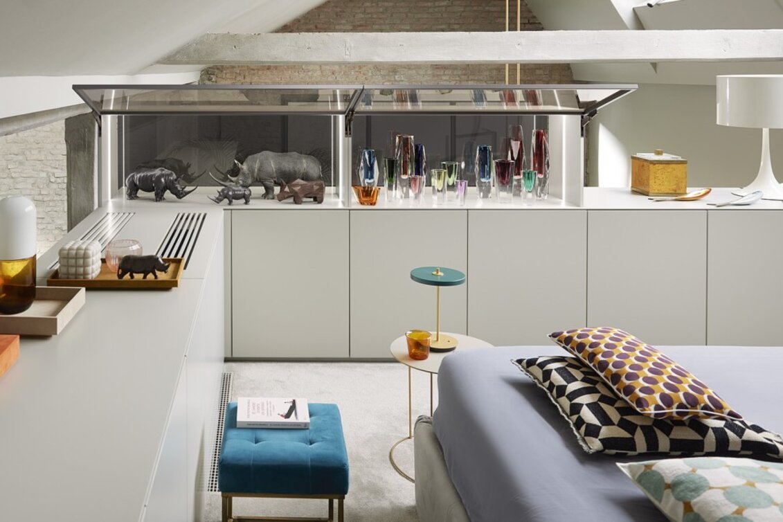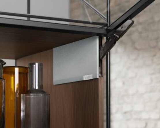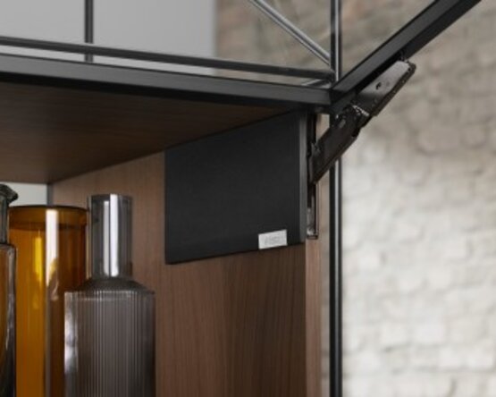 Dokonca aj pri použití sklenených čiel nie je kovanie na výklopy systému AVENTOS HKi vidieť, keď je nábytok zatvorený. Až po otvorení sa tieto viditeľné časti systému AVENTOS HKi odhalia v elegantnej čiernej onyxovej farbe.