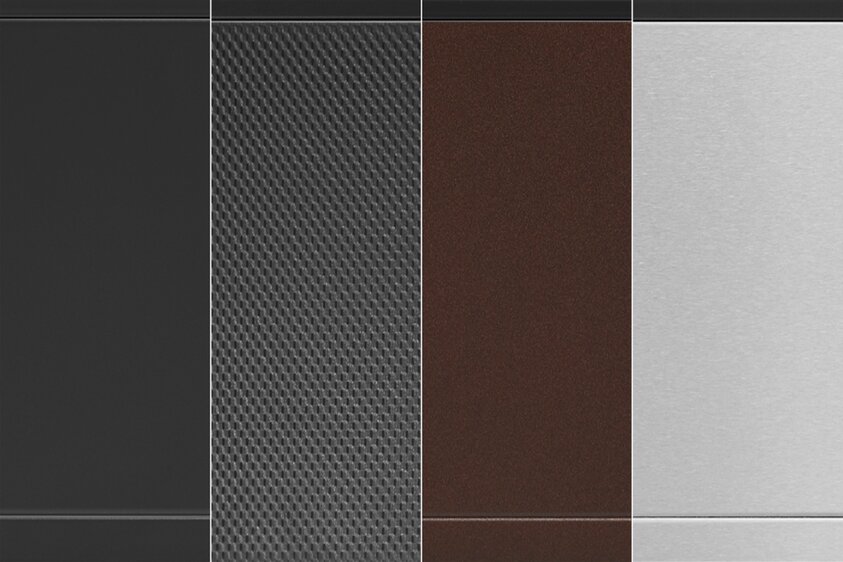 Zľava - karbónovo čierna matná, carbon look vo farbe karbónovo čiernej matnej, ušľachtilá hrdza a ušľachtilá nerez oceľ s anti fingerprint povrchom.