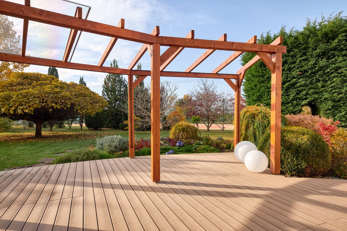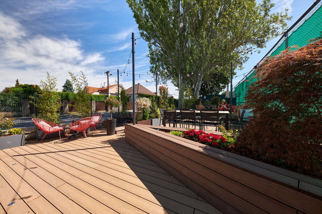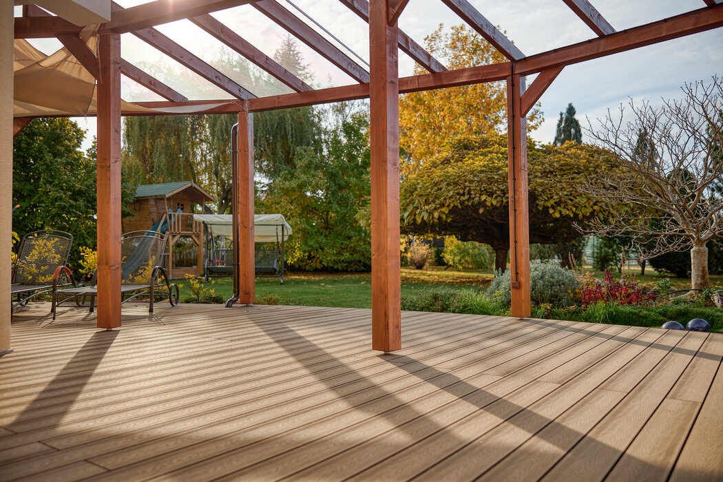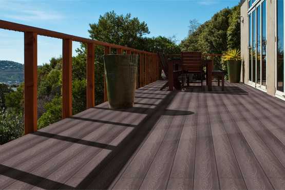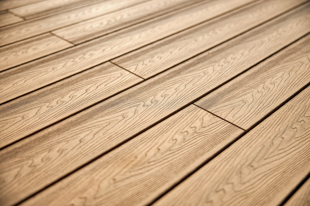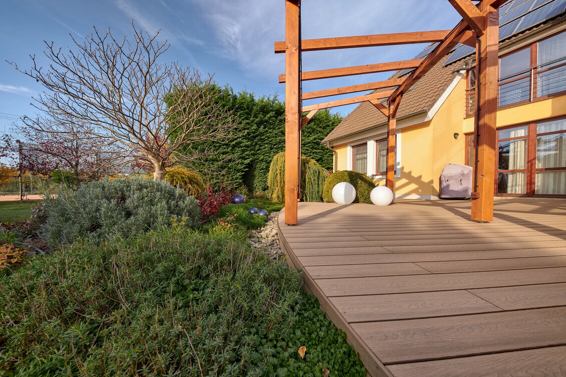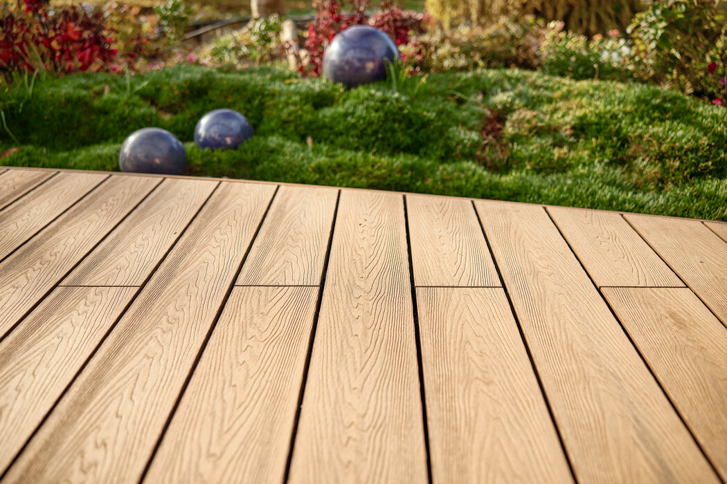 Terasová doska WPC Gardin Natur 23 × 146 mm, kompozitné alebo nerezové príchytky so skrutkami z nerezovej ocele, ploché koncové lišty a koncové krytky.